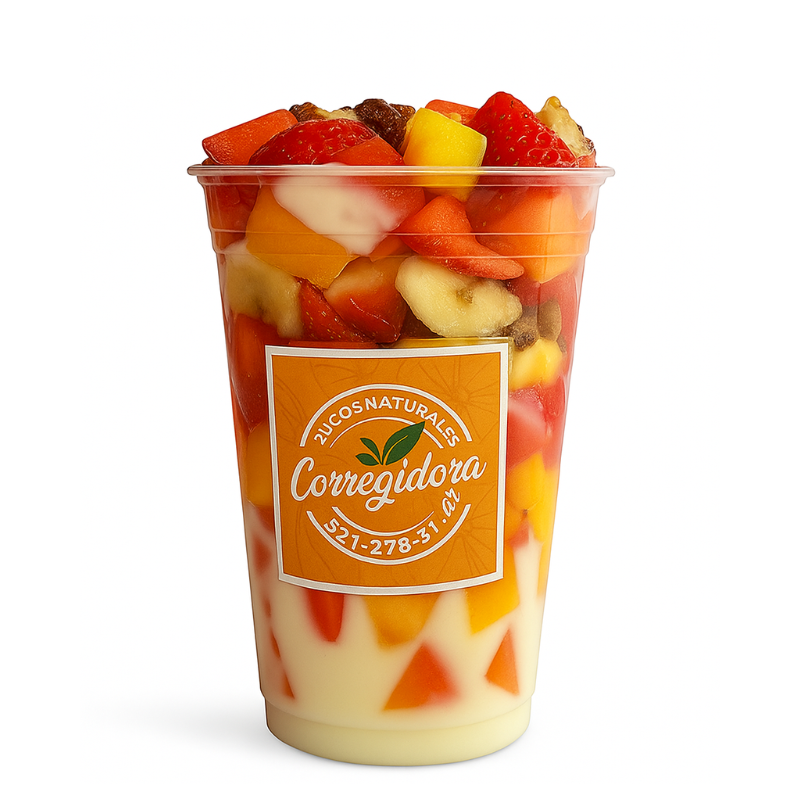 Coctel balanceado con manzana, plátano y melón, servido con yogurt natural, miel y granola para un sabor único.”