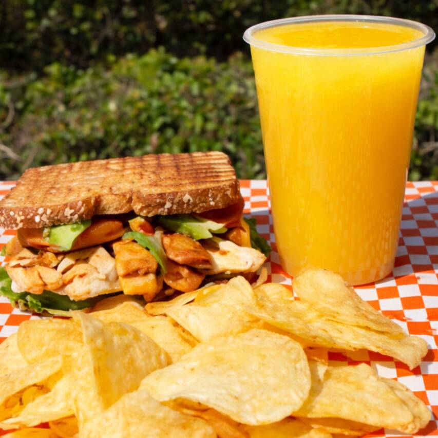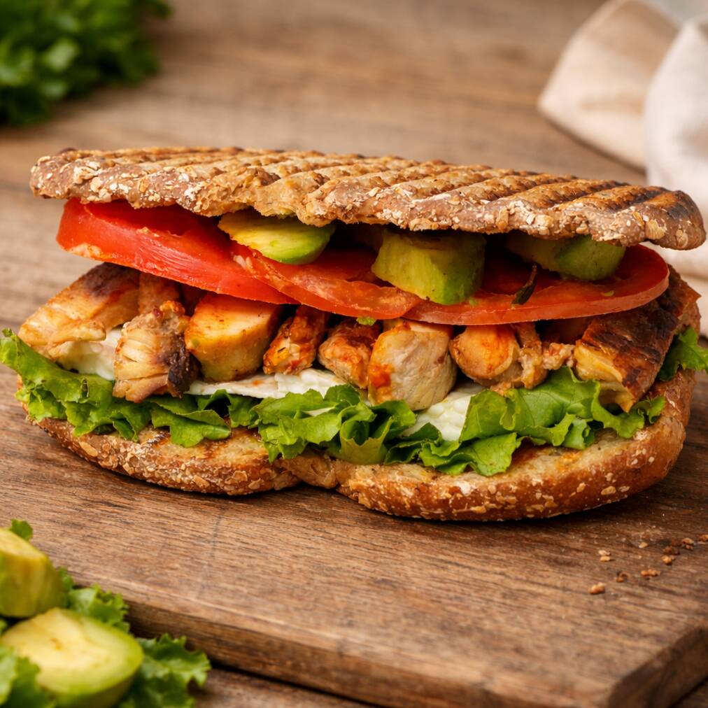 Sándwich de Pechuga de Pollo Asada preparado con pan Oroweat de 12 granos, pechuga de pollo asada al punto perfecto, fresca lechuga italiana, jitomate, aguacate, mayonesa y tu elección de queso panela, manchego, oaxaca o amarillo; para darle un toque picante puedes elegir entre chipotle, rajas en vinagre o salsa macha artesanal.