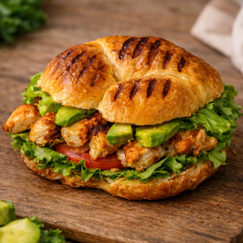 Baguette de Pechuga de Pollo Asada preparado con pan baguette de finas hierbas, pechuga de pollo asada al punto perfecto, acompañado de lechuga fresca, jitomate, aguacate y mayonesa, con la opción de agregar queso panela, manchego, oaxaca o amarillo; si lo deseas con un toque picante puedes elegir entre chipotle, rajas en vinagre o salsa macha artesanal.