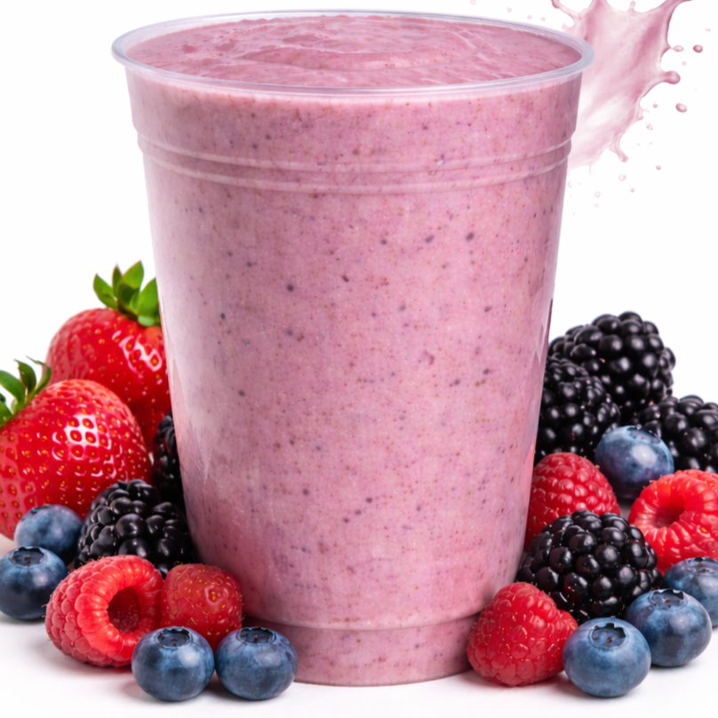 Fresa, frambuesa, mora azul y arándano en un licuado enorme y súper fresco. Tú eliges la leche y, si se te antoja, puedes darle un plus con granola, nueces, almendras o más arándanos.
