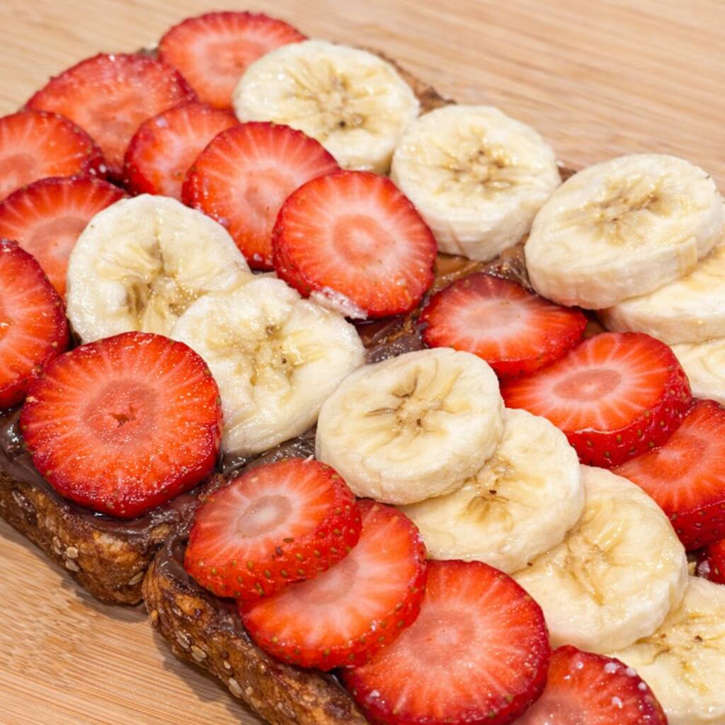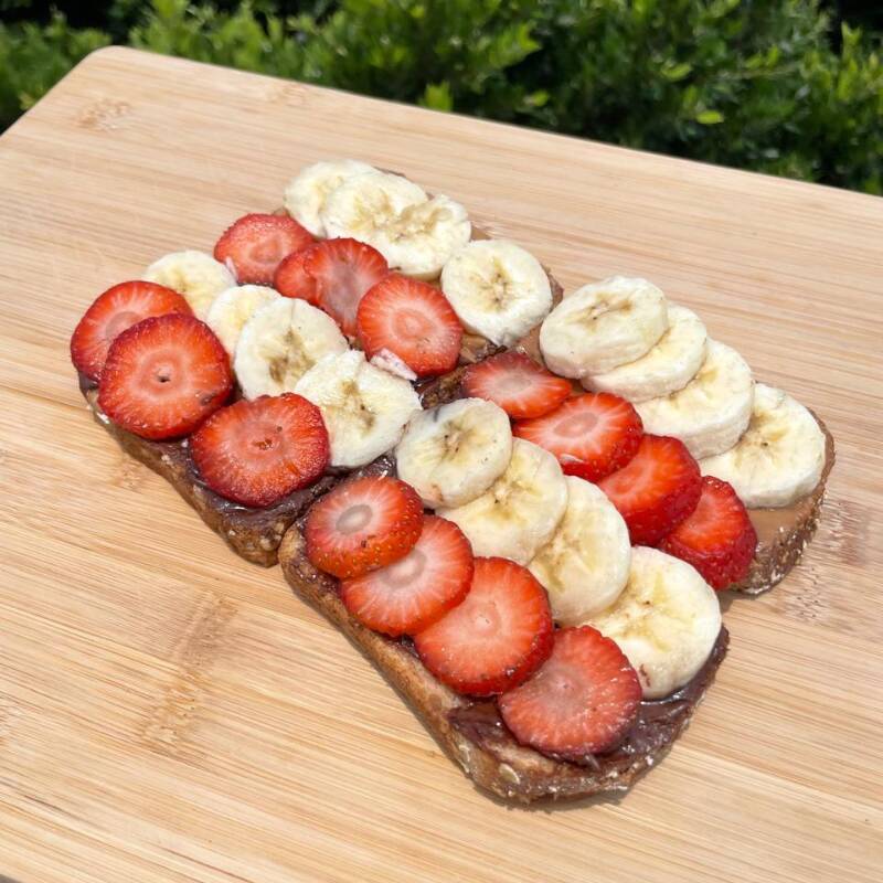 Pan Dúo preparado con pan Oroweat de 12 granos tostado, acompañado de rodajas frescas de fresa y plátano, combinado con crema de cacahuate y crema de avellanas, creando un balance delicioso entre lo saludable y lo dulce, ideal para el desayuno.