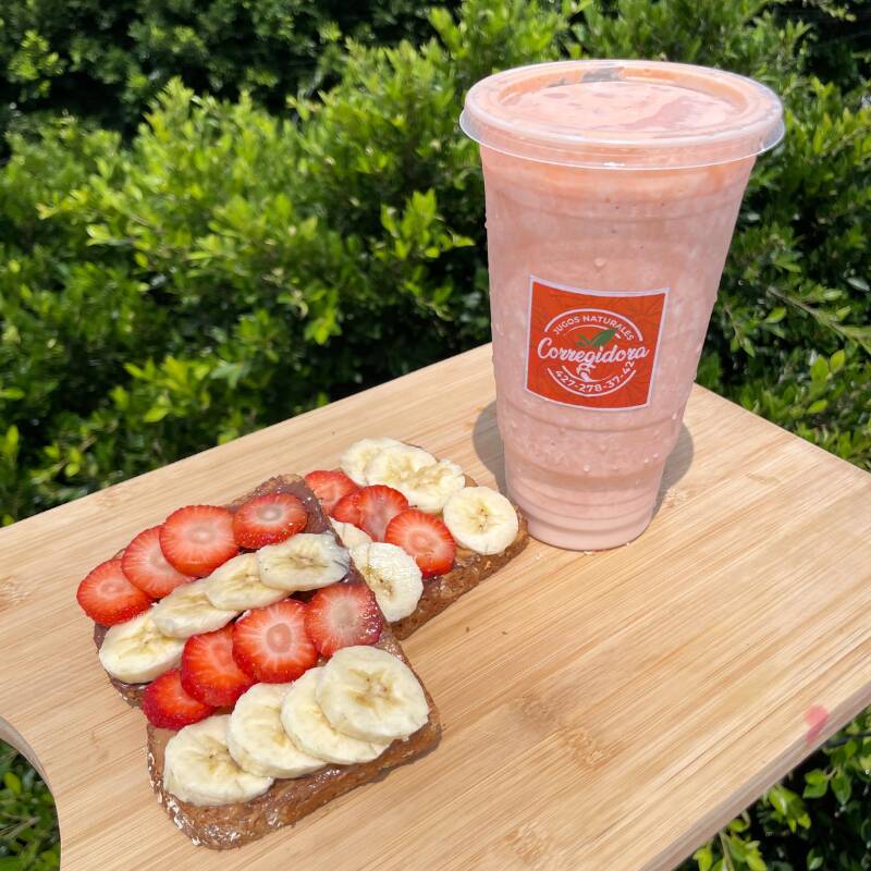 Disfruta un licuado de fruta a tu elección acompañado de un pan duo integral con crema de cacahuate, crema de avellana, fresa y plátano. Una combinación dulce, deliciosa y perfecta para empezar el día con buena energía.