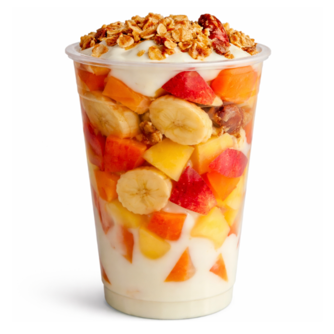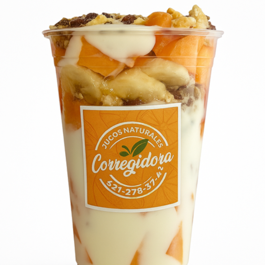 Coctel balanceado con manzana, plátano, papaya y melón, servido con yogurt natural, miel y granola para un sabor único.”