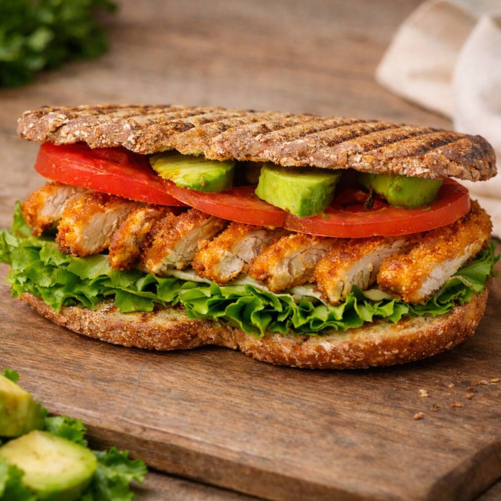 Sándwich de Milanesa de Pollo preparado con pan Oroweat de 12 granos, Milanesa de Pollo , fresca lechuga italiana, jitomate, aguacate, mayonesa y tu elección de queso panela, manchego, oaxaca o amarillo; para darle un toque picante puedes elegir entre chipotle, rajas en vinagre o salsa macha artesanal.
