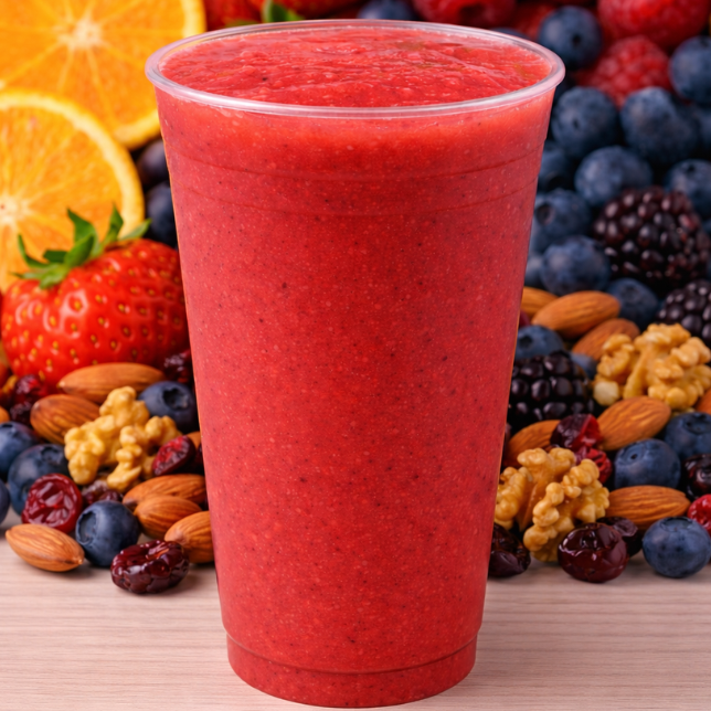 Frutos rojos con nuez, almendra y avena en una mezcla potente y nutritiva. Ideal para recargar energía. 500 ml.