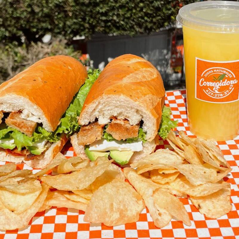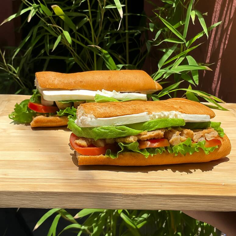 Baguette de Milanesa de Pollo elaborado con pan baguette de finas hierbas, milanesa de pollo dorada y crujiente, acompañada de lechuga fresca, jitomate, aguacate y mayonesa, con la opción de agregar queso panela, manchego, oaxaca o amarillo; si lo prefieres con un toque de picante puedes elegir entre chipotle, rajas en vinagre o salsa macha artesanal.