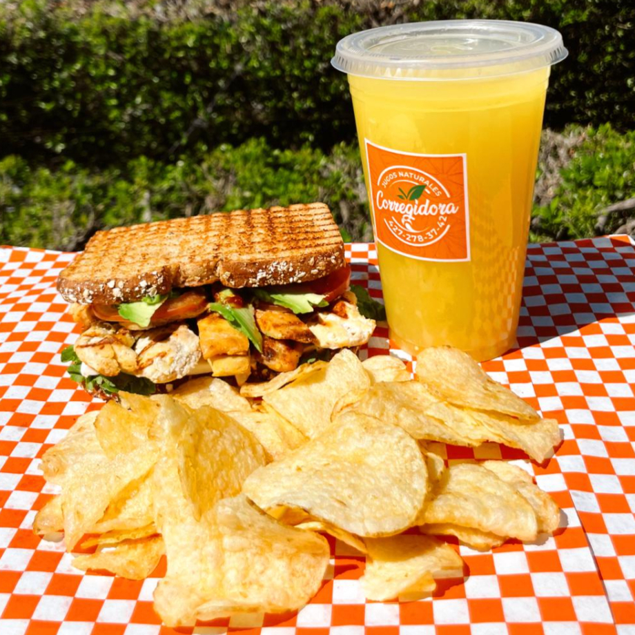 Un jugo verde lleno de vitalidad preparado con pepino, piña, perejil, apio, nopal y espinaca, acompañado de un sándwich de pechuga de pollo asada con el toque justo de frescura y sabor. 💚 Ligero, delicioso y perfecto para sentirte bien mientras disfrutas cada bocado. ¡Pídelo ahora y dale a tu cuerpo un impulso natural!⚡