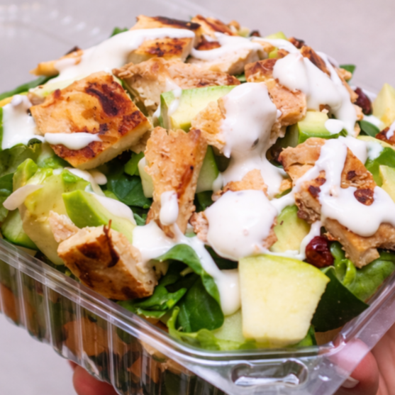 Ensalada fresca y abundante preparada con lechuga y espinaca, pepino, zanahoria rallada, manzana, arándano, almendra y aguacate, acompañada de proteína a elegir. Incluye 1 aderezo de 25 g a elegir entre chipotle, ranch, mil islas o macha. Ideal para una comida completa, ligera y balanceada.