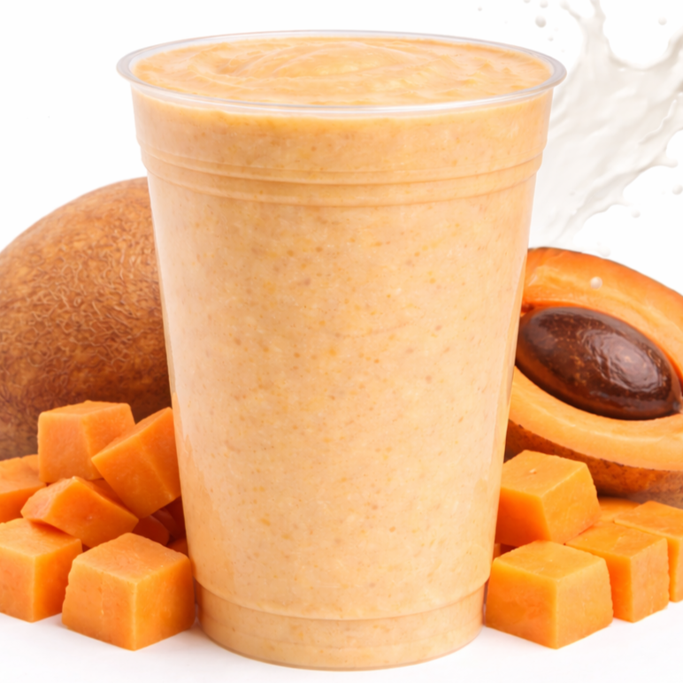 Licuado de mamey preparado al momento con fruta natural, leche, canela y vainilla, sin concentrados ni polvos. Puedes hacerlo grande (900 ml) o agregar ingredientes como frutos rojos, nuez, almendra, avena o arándano, además de elegir tu tipo de leche y endulzante.