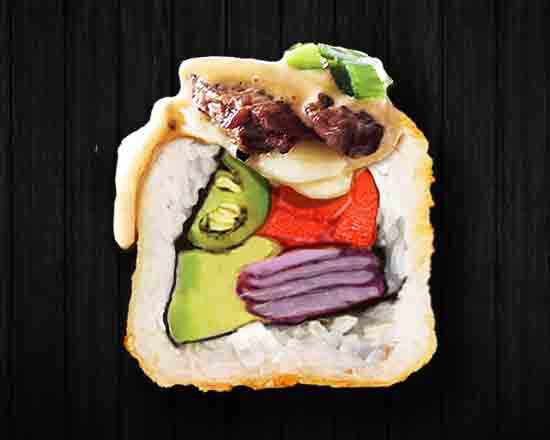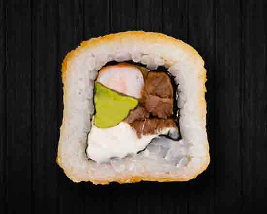 10 pz. Por dentro: Camarón, res, aguacate y Philadelphia. Por fuera crujiente empanizado.