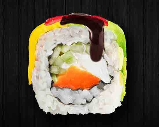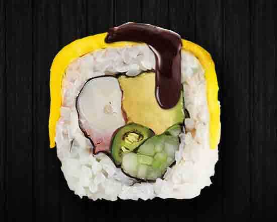 Por dentro camarón empanizado, Philadelphia, aguacate y masago, por fuera alga empanizada, aderezo chipotle, salsa de anguila y cebollín. 10 pz.