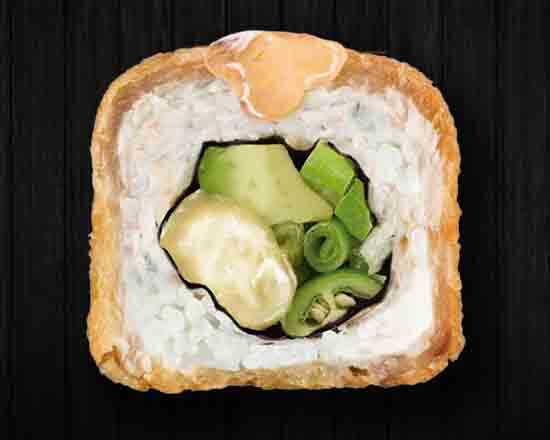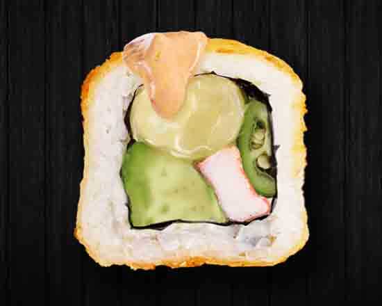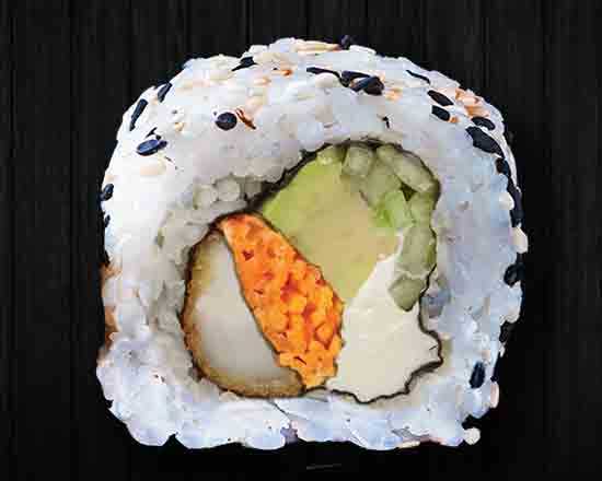 Surimi empanizado, aguacate, pepino y Philadelphia. Por fuera aderezo tampico. 10 pz.