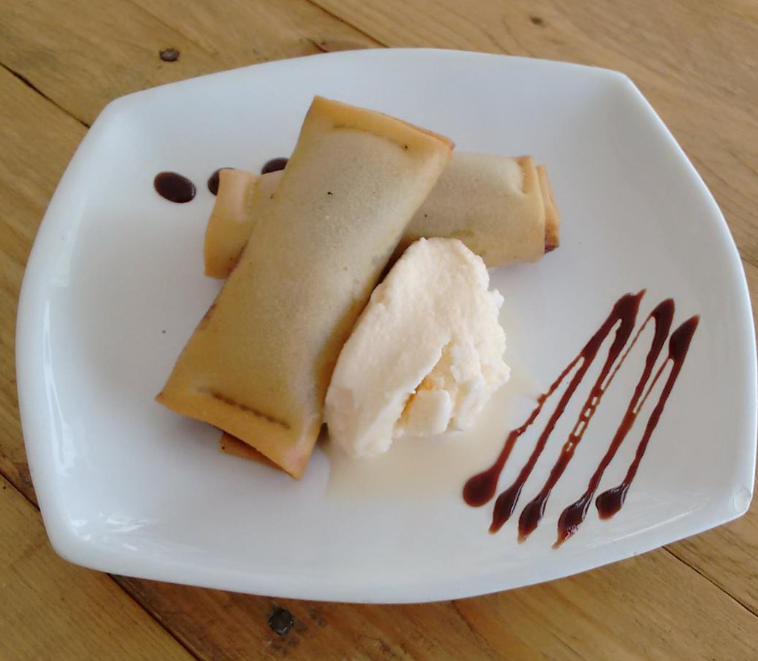 Par de rollitos rellenos de Philadelphia y mermelada de zarzamora, escarchados con azucar y canela, servidos con helado de vainilla.
