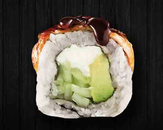 10 pz. Philadelphia, aguacate y camarón tempura. Por fuera pepino y salsa de anguila.