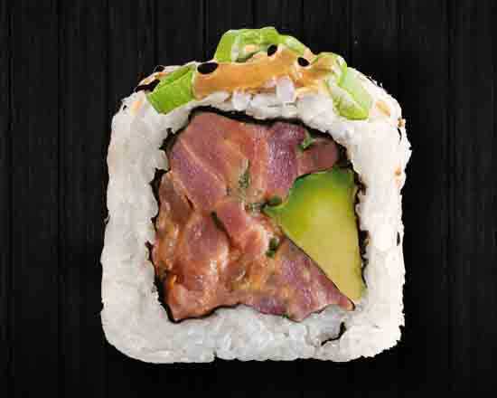Atún spicy, aguacate, cebollín y sésamo.