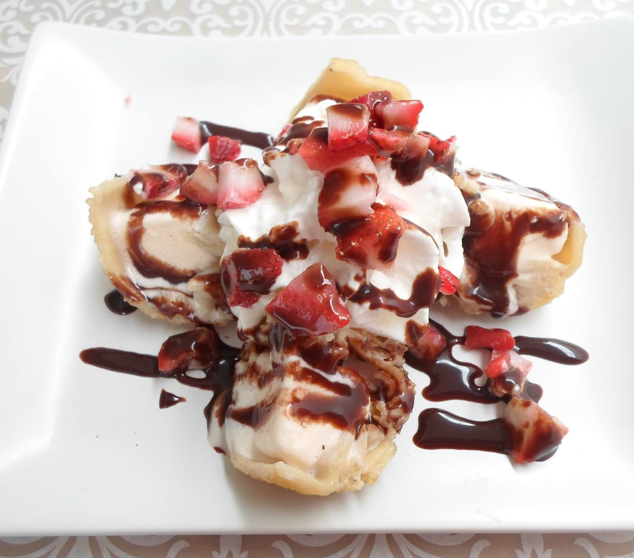 Típico postre japonés de delicioso helado de vainilla frito, servido con crema batida de fresas y chocolate Hershey´s.