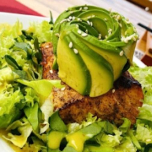 250 gr. Mix de lechugas acompañadas de aguacate, espinaca, germen de soya y trozos de salmón. a la plancha servido con aderezo de miel y mostaza.