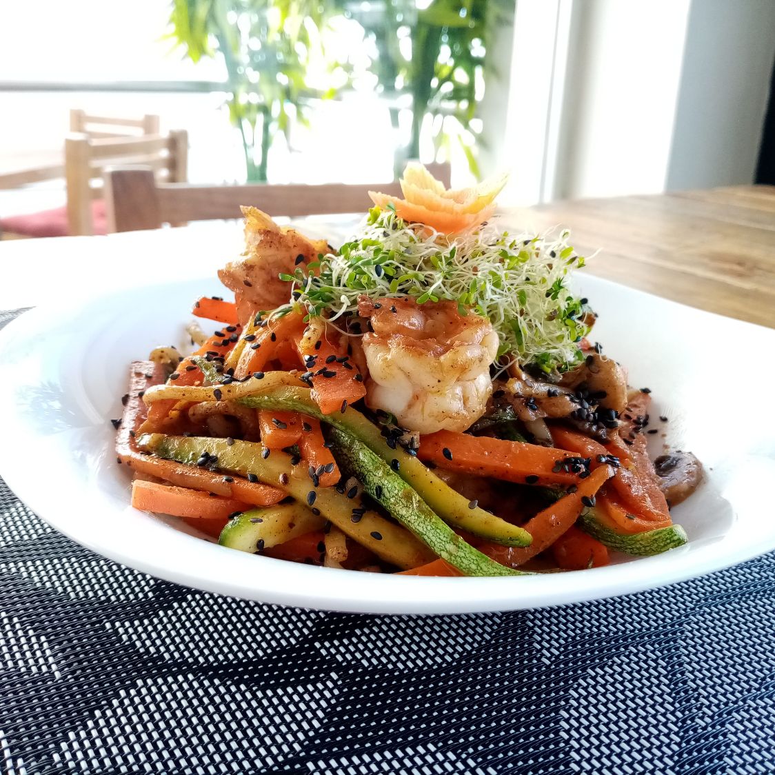 350 gr. Deliciosa pasta udón con calabaza, champiñón, zanahoria y camarón, todo salteado y bañado con nuestro aderezo de chipotle y cebollín.