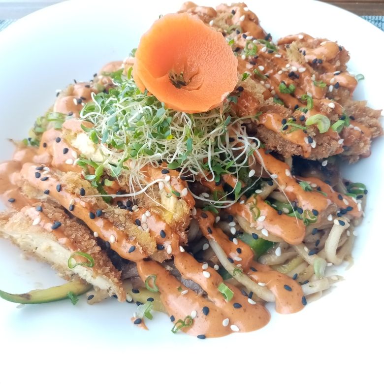 Pechuga de pollo empanizada servida con pasta udón, cebolla frita, vegetales, salsa teriyaki y aderezo chipotle.