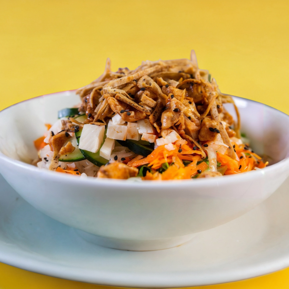Cama de lechuga, pollo buffalo, jícama, zanahoria, pepino, queso panela, tortillitas y ajonjolí.