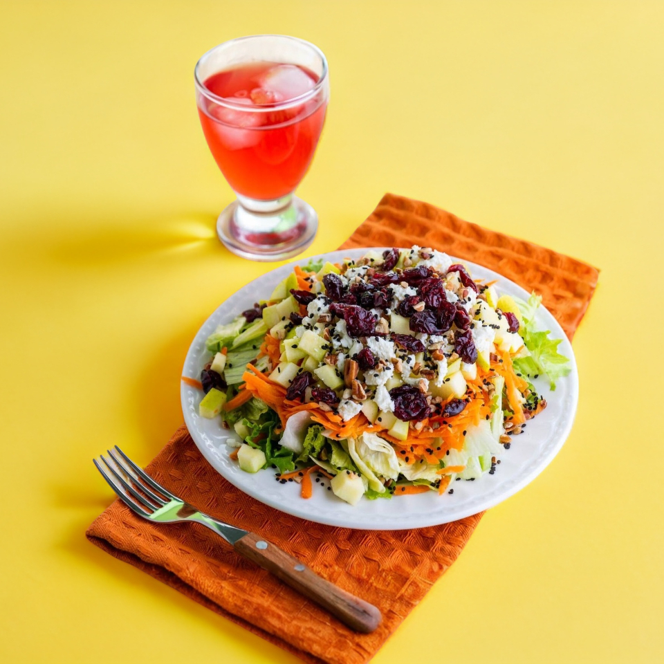Cama de lechuga, zanahoria, manzana, nuez, arándanos, queso de cabra y ajonjolí