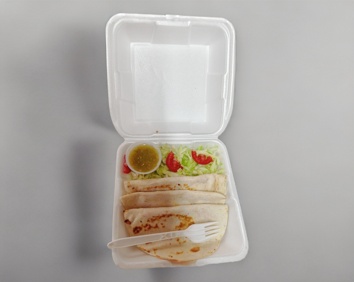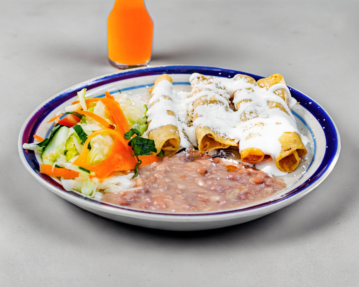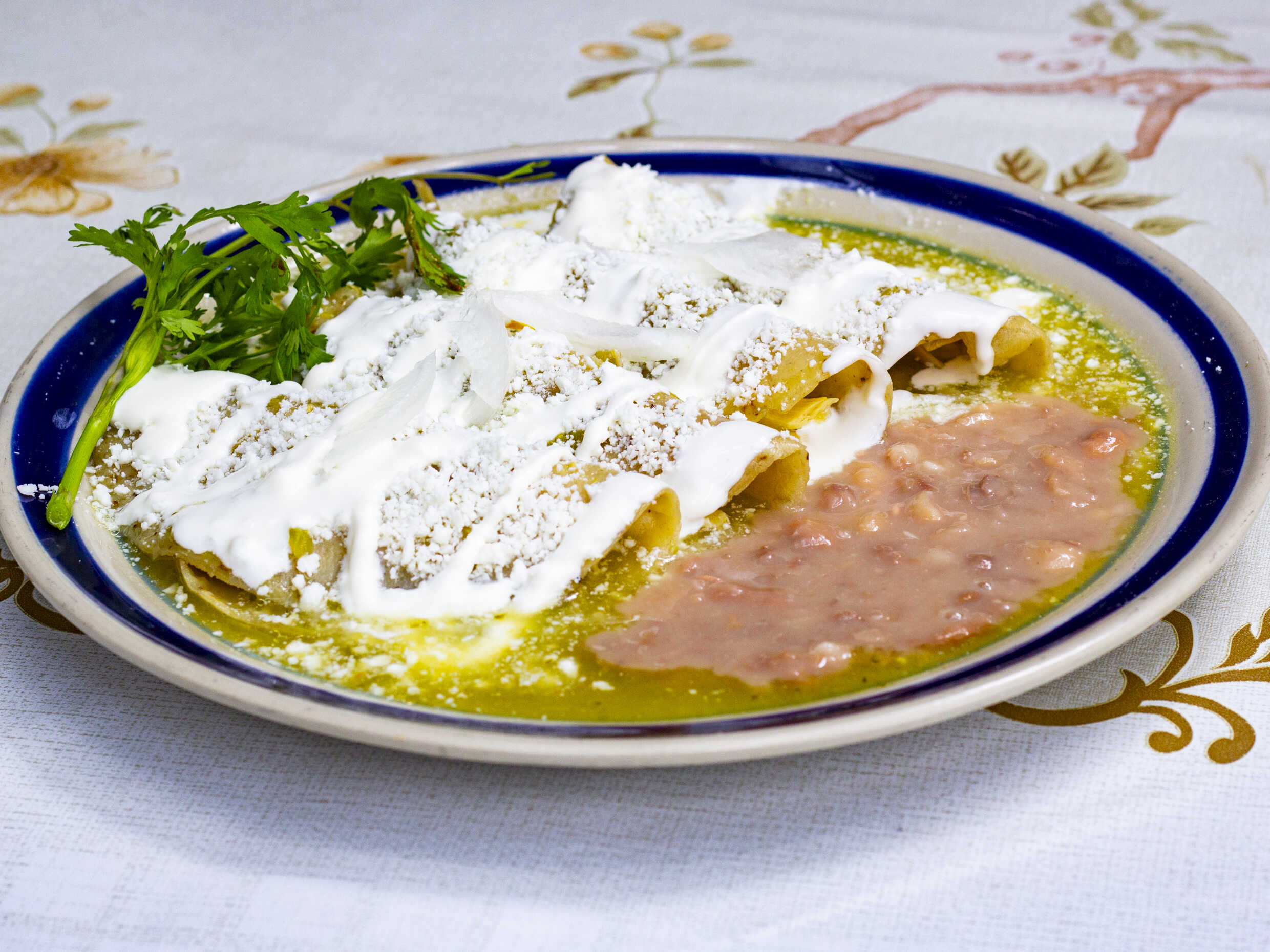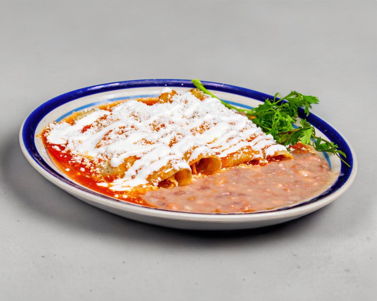 4 Enchiladas bañadas en salsa roja con pollo, queso, crema y frijoles refritos.