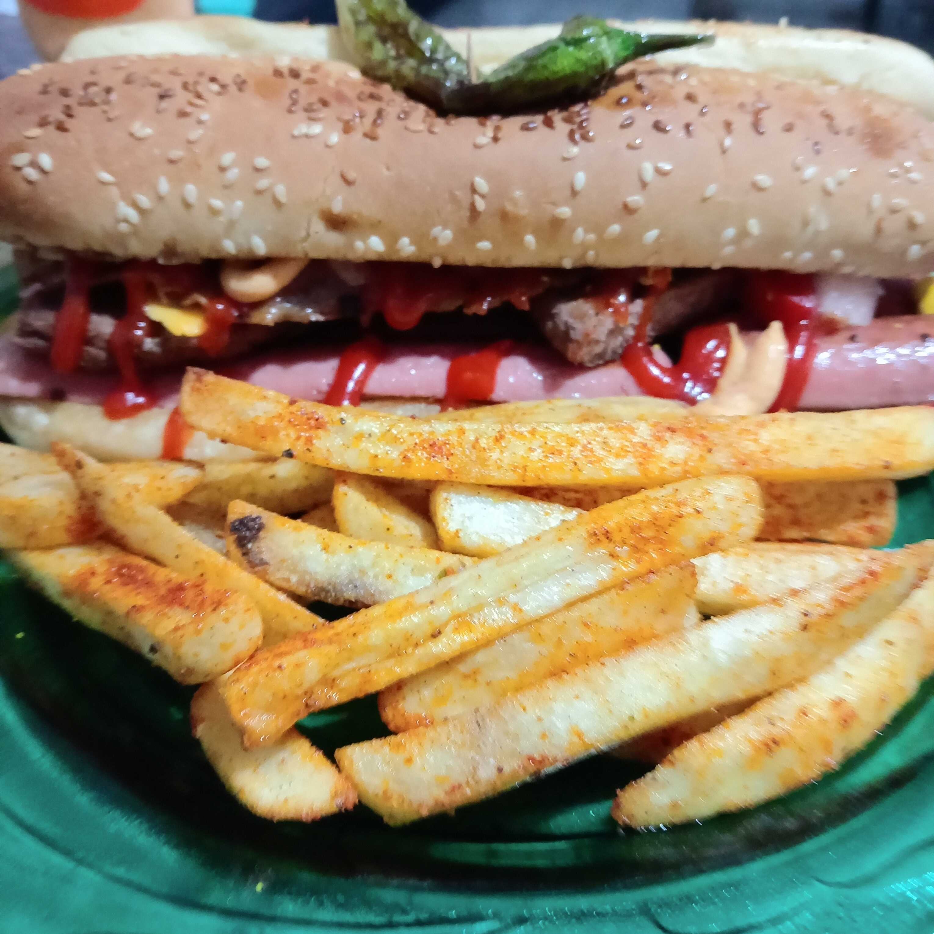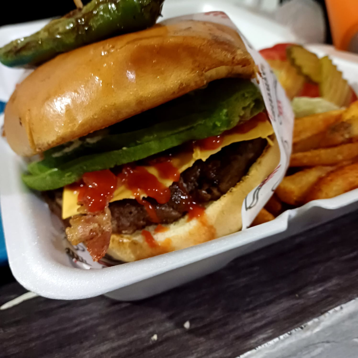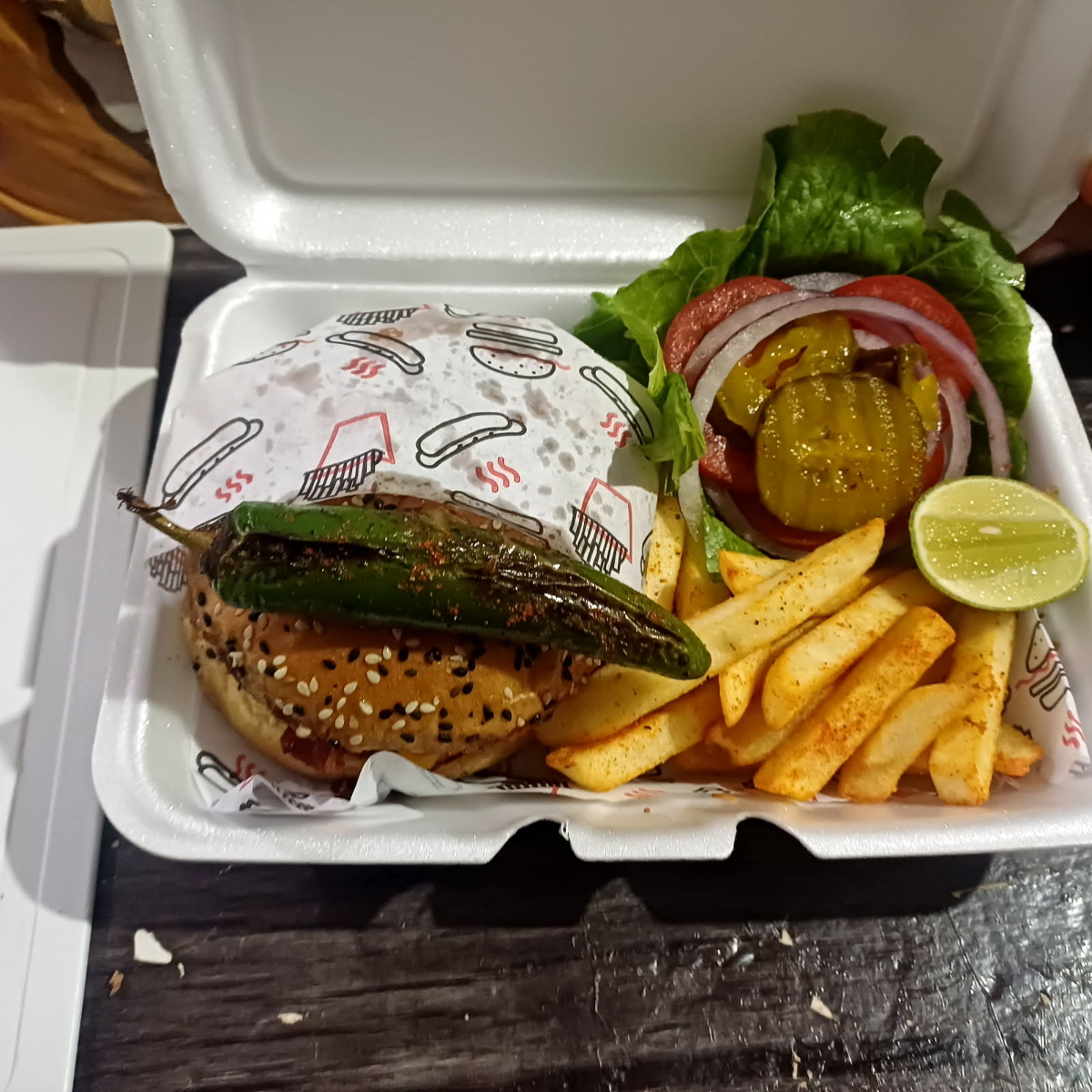 Delicioso bollo brioch , jugosa carne de res de la casa, Jitomate, Lechuga, pepinos, Cebolla, chiles toreados, aderezo de la casa, 2 pza de hot dogs, papas a la francesa, y refresco