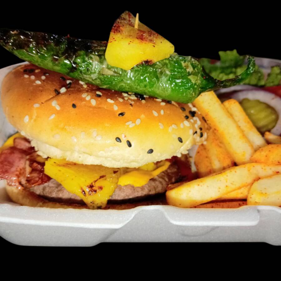 Carne al carbón 100% res, piña receta de la casa, tocino, aderezo, Lechuga, Jitomate, pepinos, Cebolla y papas.
