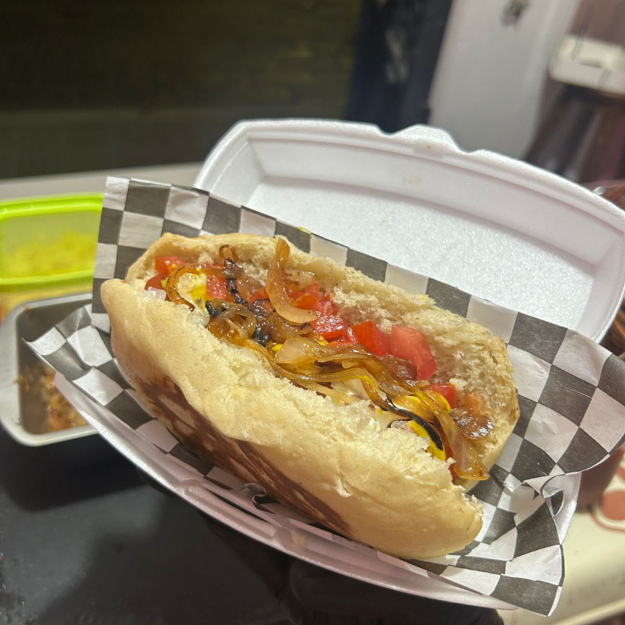 Salchicha, jitomate, cebolla cruda, cebolla caramelizada, tocino, cátsup, mostaza, mayonesa.