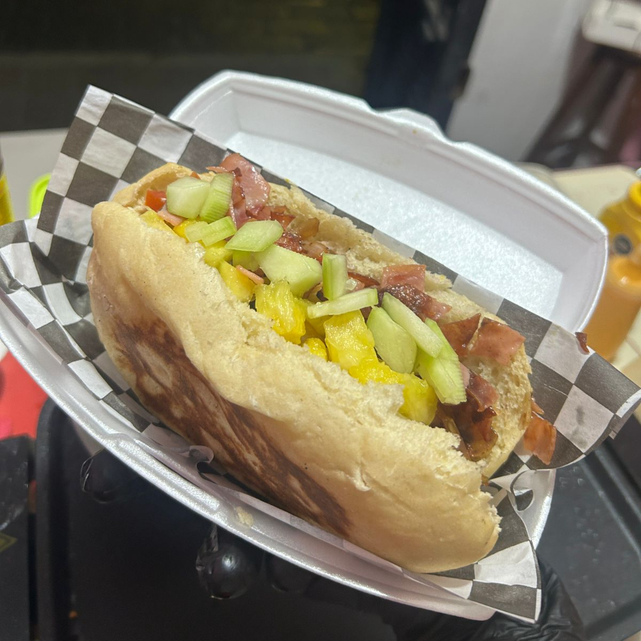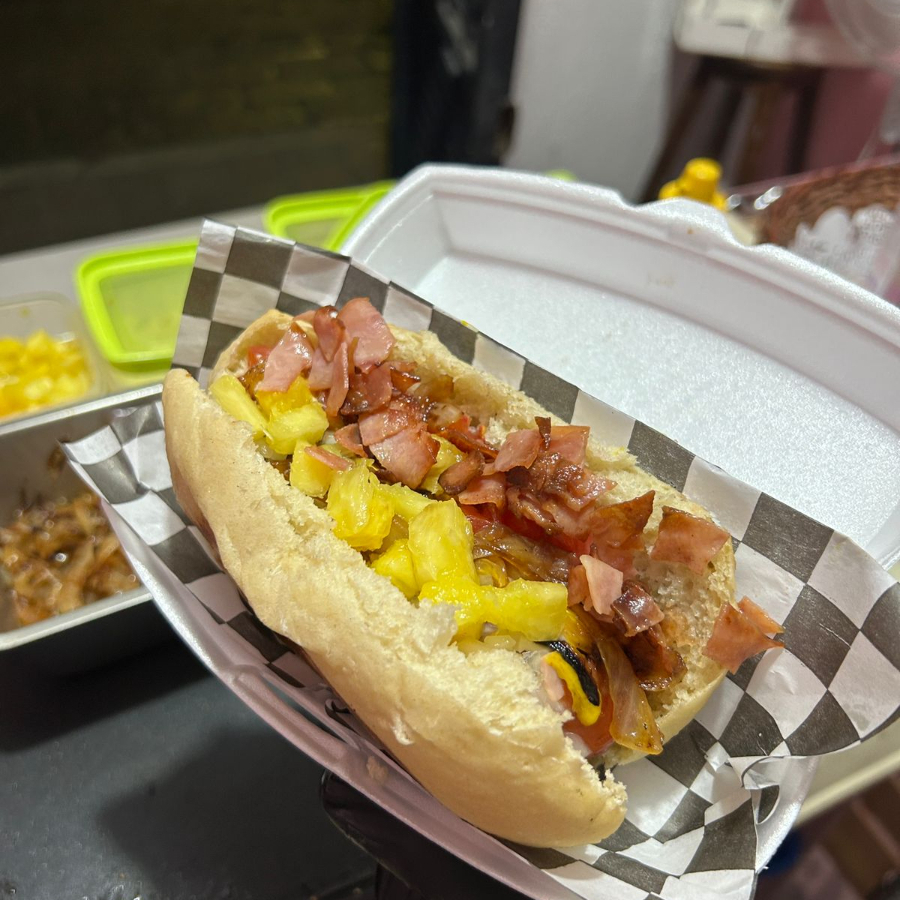 Salchicha, tomate, cebolla cruda, cebolla caramelizada, piña, pepino, tocino, cátsup, gusup, mayonesa, mostaza.