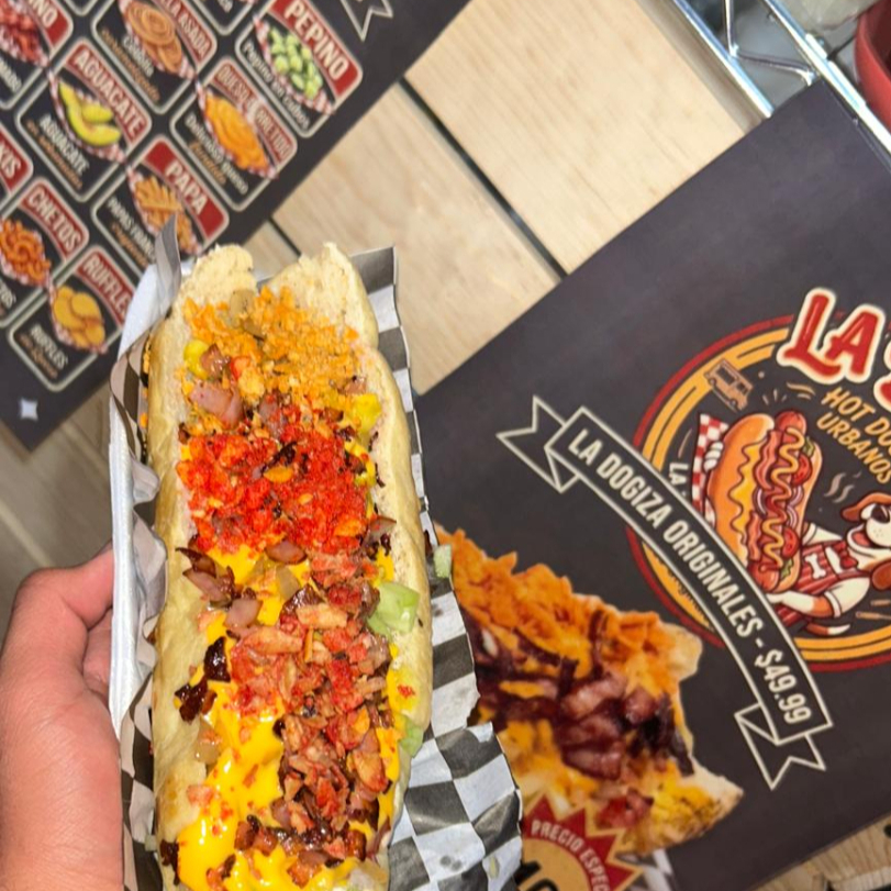 Salchicha, jitomate, cebolla cruda, cebolla caramelizada, piña, pepino, tocino, aguacate, queso derretido, cátsup, mostaza, mayonesa. Incluye papa de elección.