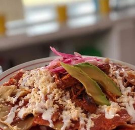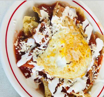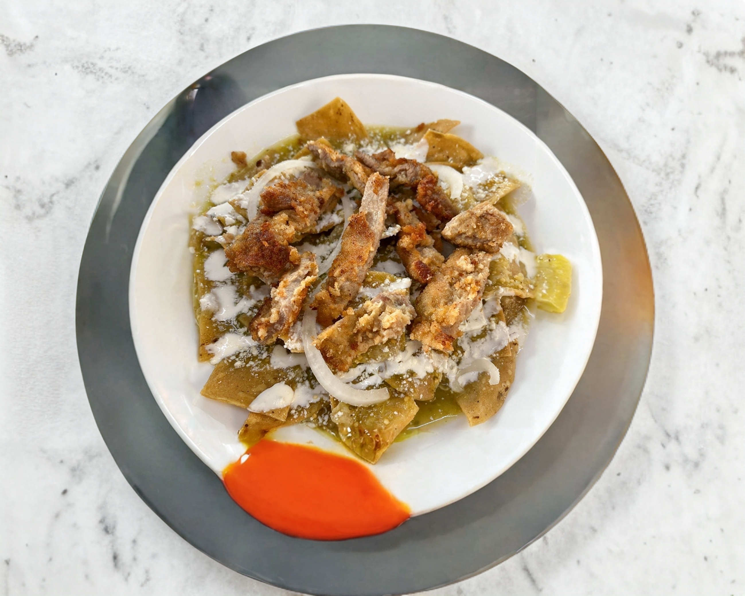 Chilaquiles con crema, queso canasto y cebolla. Acompañados de tu elección de salsa: verde, roja, morita, frijol, mole o guajillo.