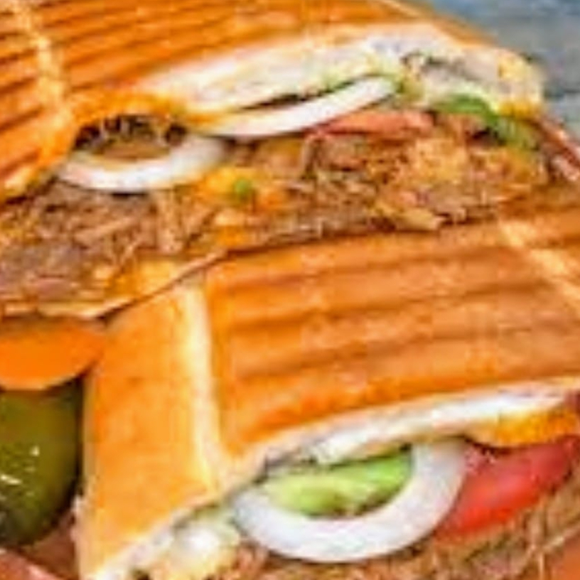 Nutritiva torta de pierna adobada, frijles refritos, mayonesa, cebolla, aguacate, jitomate, lechuga, chiles, planchada en mantequilla