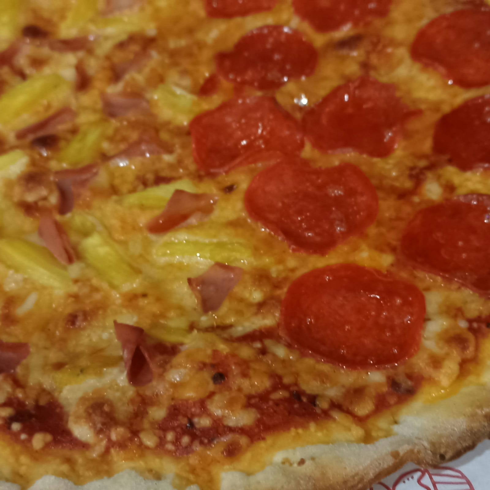 1/2 hawaiana, Y 1/2pepperoni, mediana