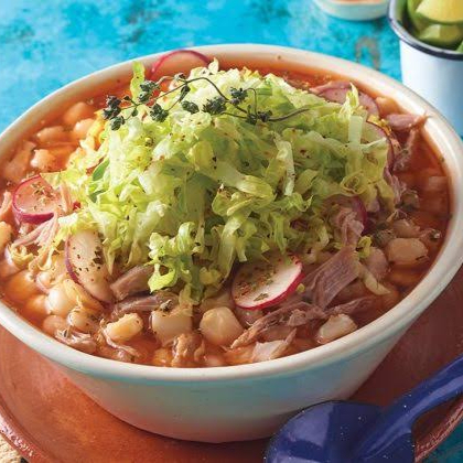 Maíz pozolero, mezcla de chiles, cabeza de cerdo, lechuga, cebolla, limones y 4 tostadas de maiz