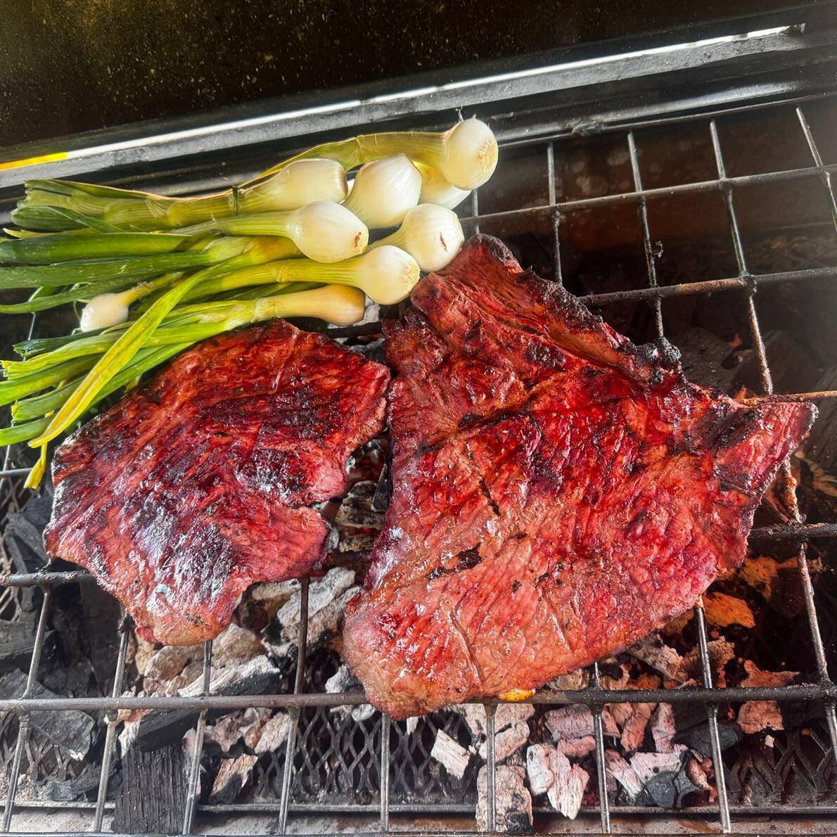 1 orden de arrachera de puerco (350g) asada al carbón, acompañada con papas a la francesa, chiles toreados y salsa