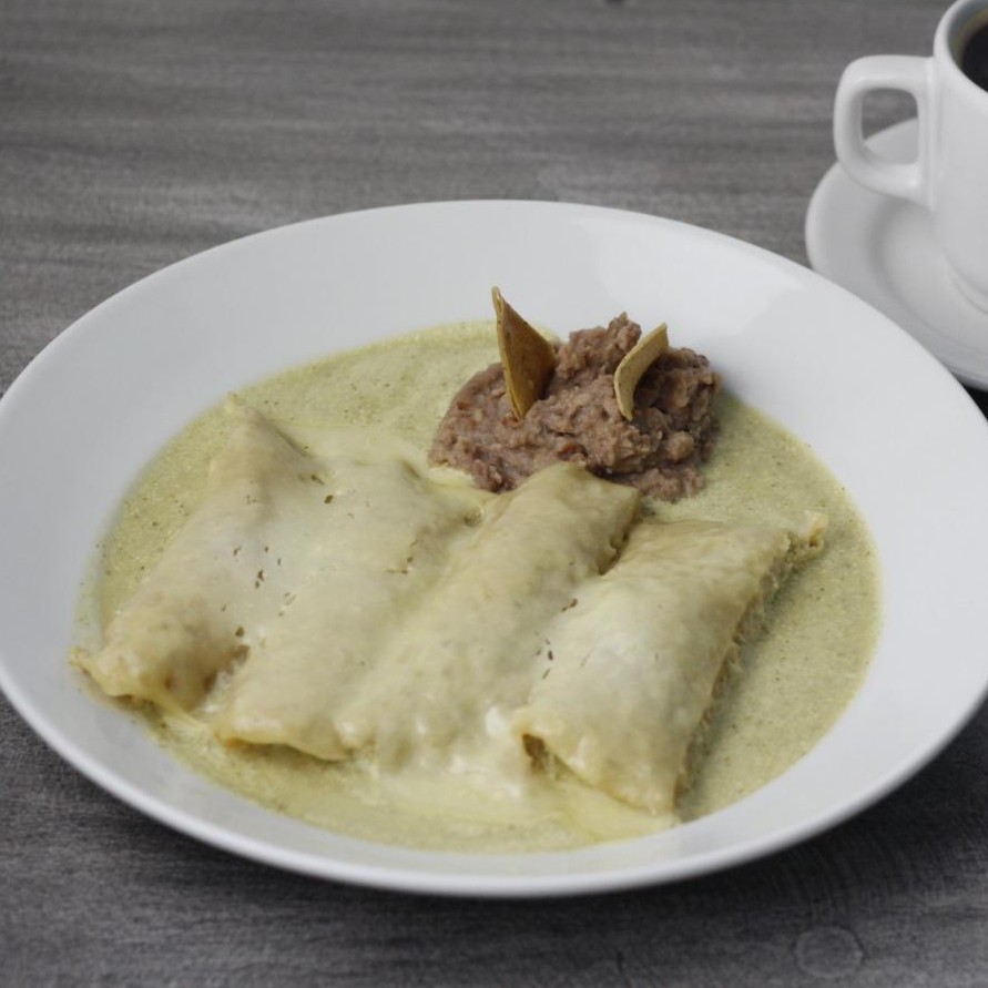 5 tortillas de maiz con salsa verde, pollo, crema y queso