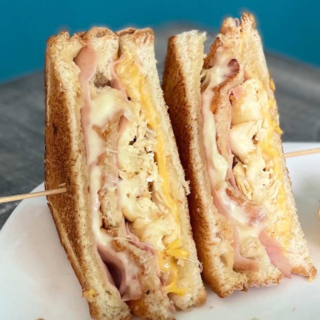 2 piezas de pan blanco, mayonesa, una rebanada de jamón, queso panela, jitomate, aguacate