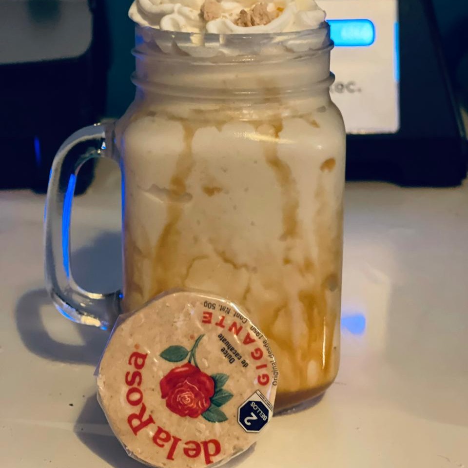 Bebida frappeada con sabor galleta con un toque de café y decorada con crema batida