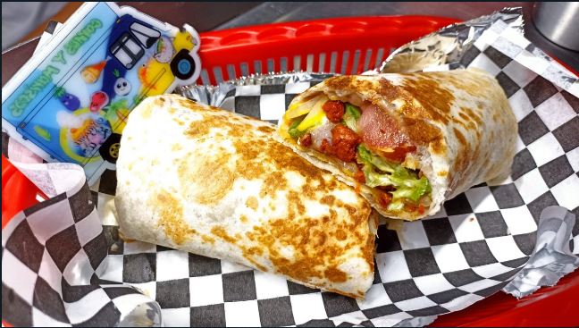 Con piña, dos quesos, tocino, queso, lechuga, jitomate, pepinillos y aguacate.