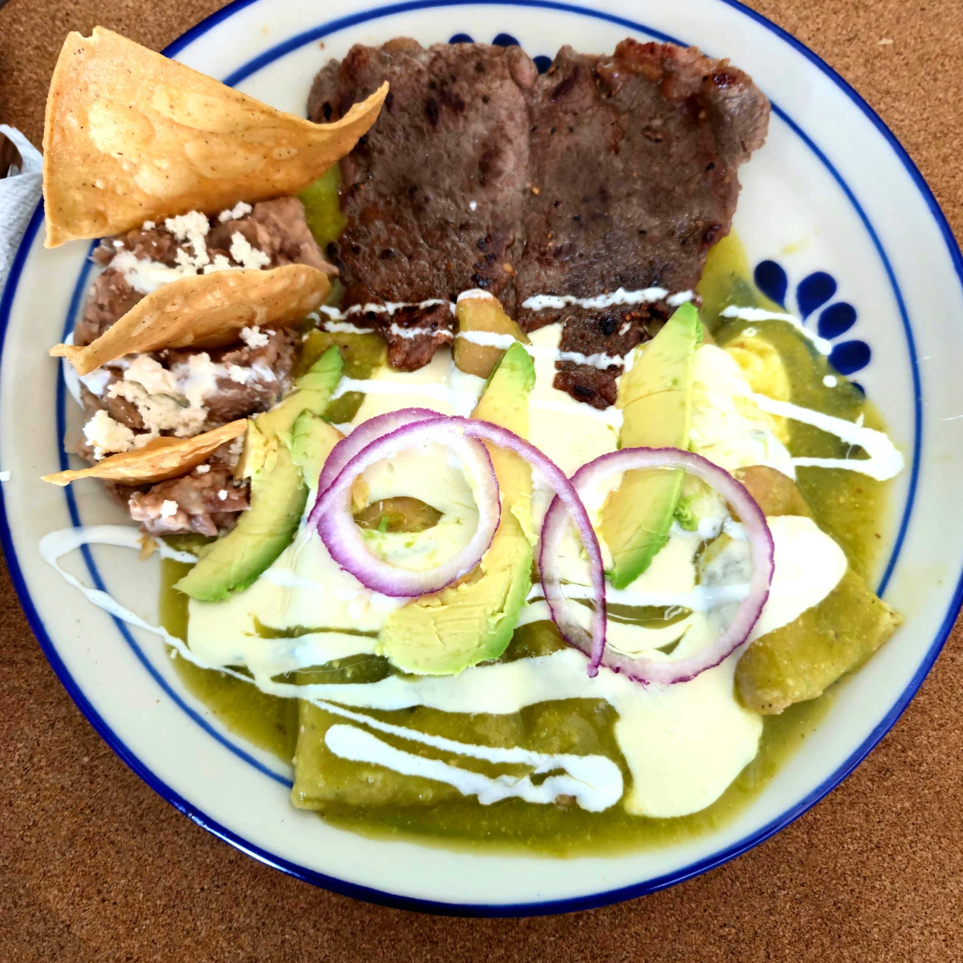 Enchiladas Verdes (pueden ser rojas si nos mandas un mensajito) con carne asada, café del bueno (fuerte, intenso, del caro) y pan. Para los que desayunan en serio.