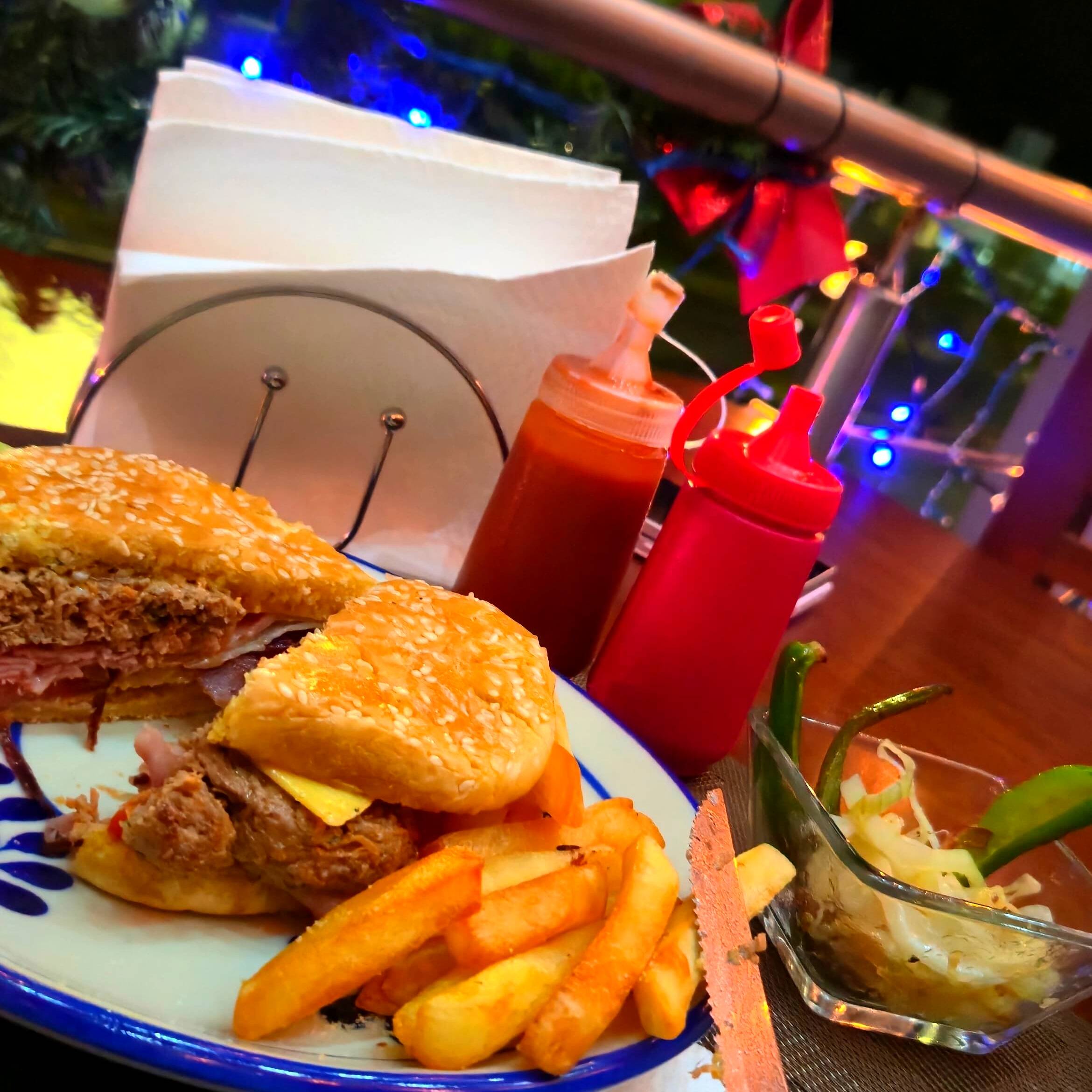 Carne jugosa, piña, tocino, queso derretido, pan dorado y aderezos de la casa. Incluye papas y COCA de una vez.