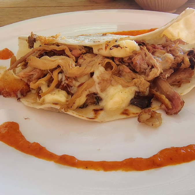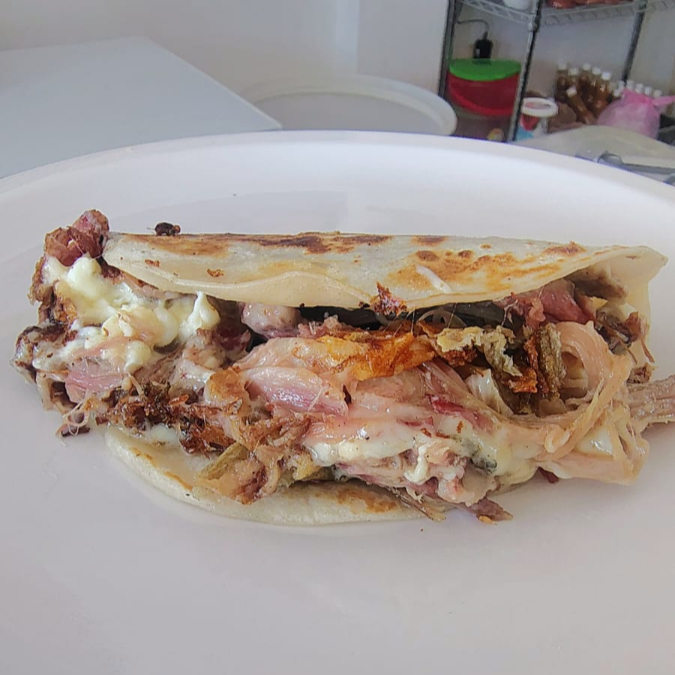 Quesadilla con barbacoa ahumada de espaldilla y cuerito, en tortilla de harina