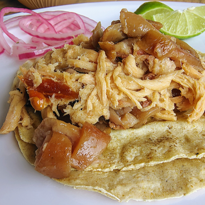 Delicioso taco de lomo en tortilla de maíz, con barbacoa ahumada de lomo de cerdo.