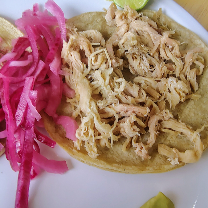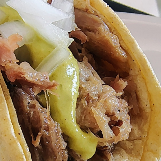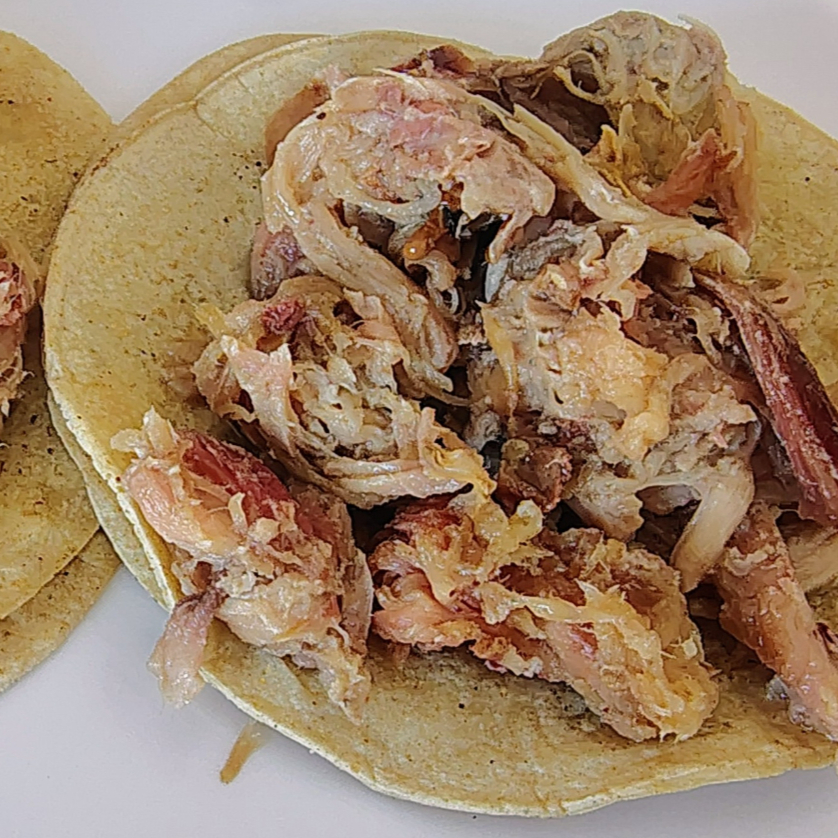 Delicioso taco en tortilla de maíz, con barbacoa ahumada de espaldilla de cerdo.