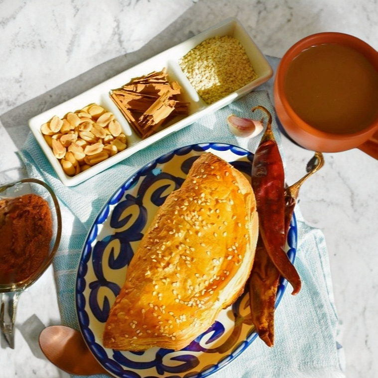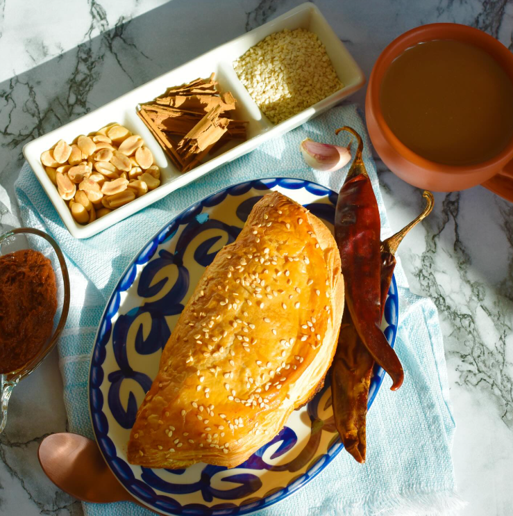 Paste con mole rojo, pollo, masa de hojaldre y toque de ajonjolí (1 pieza)