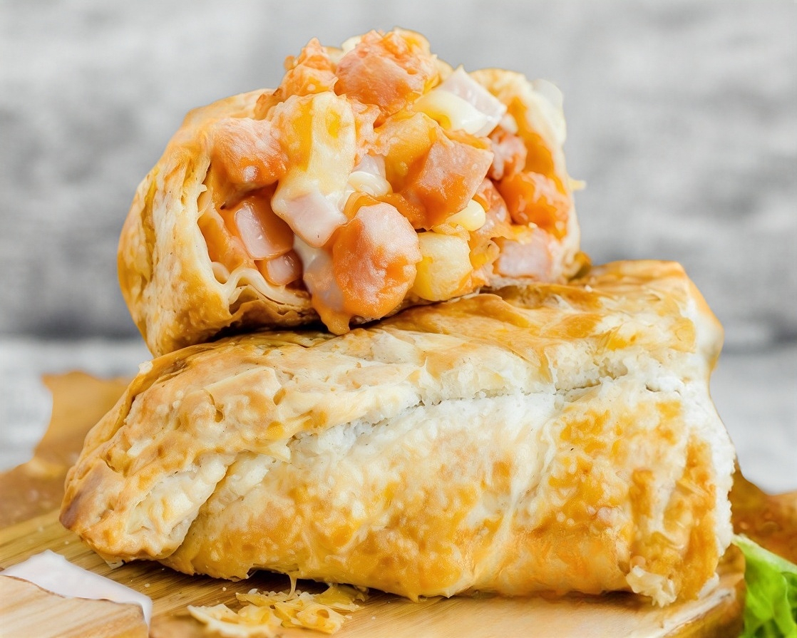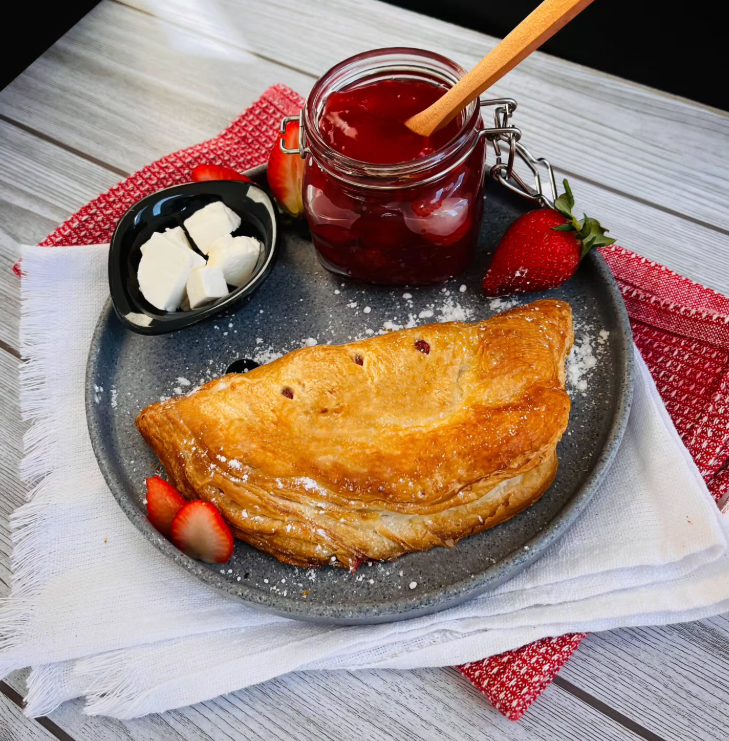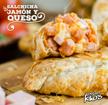 Paste con salchicha, jamón, 3 quesos Oaxaca, manchego, gouda y masa horneada de hojaldre.