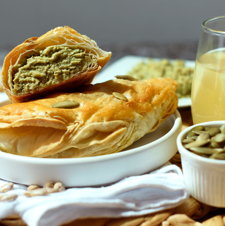 Paste con mole verde, pollo, masa de hojaldre y pepitas con sabor de la casa.