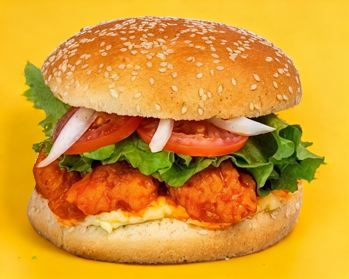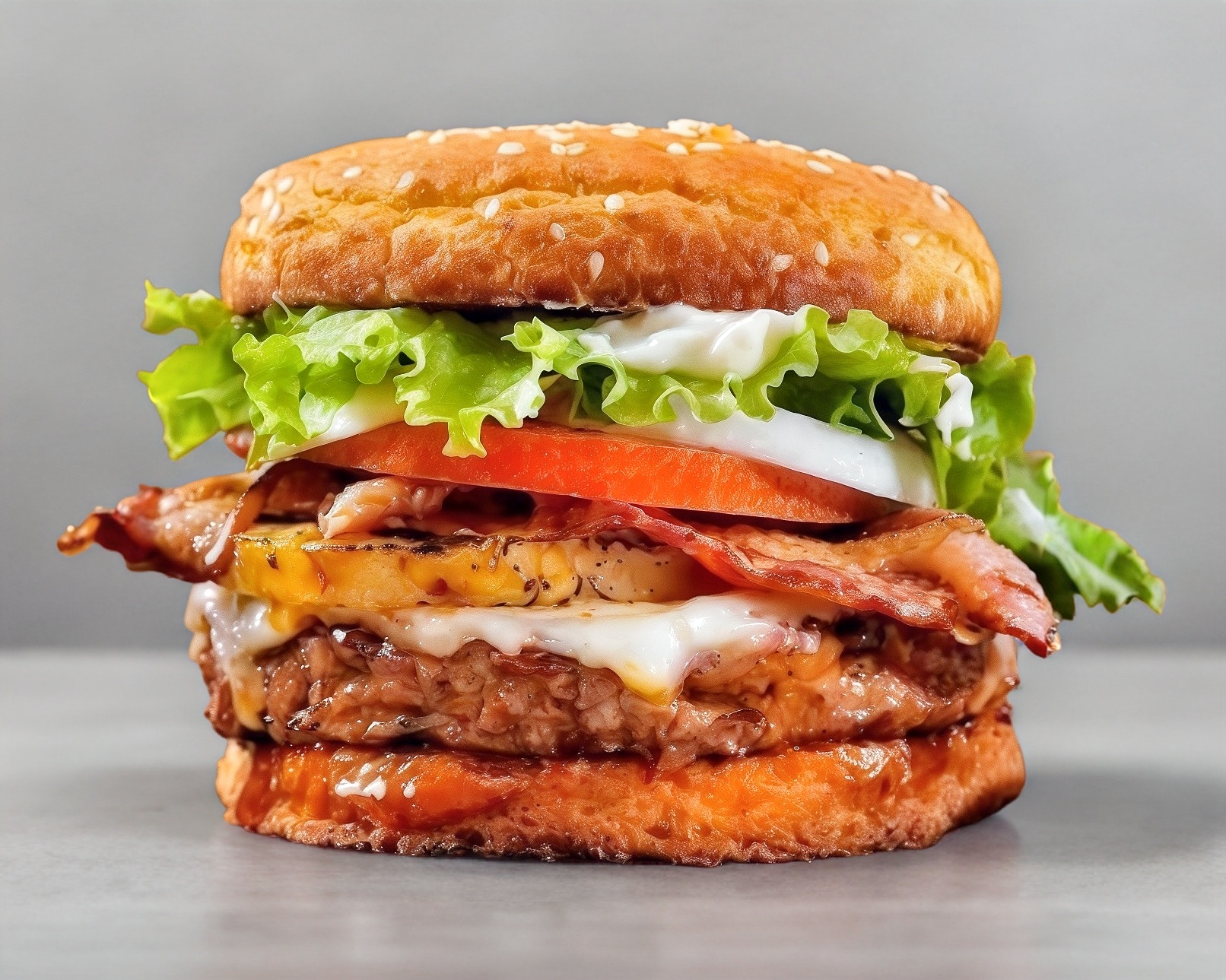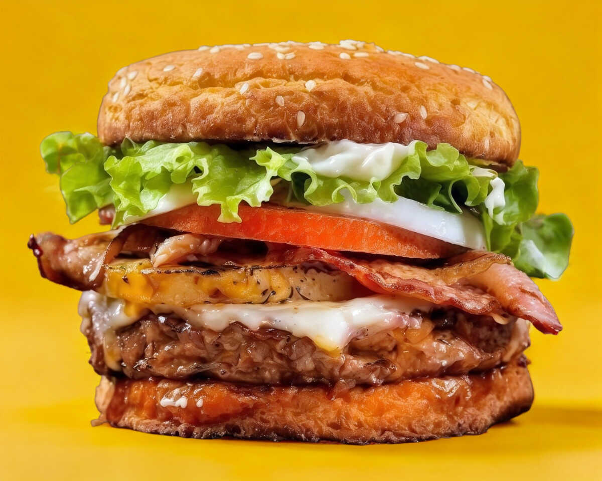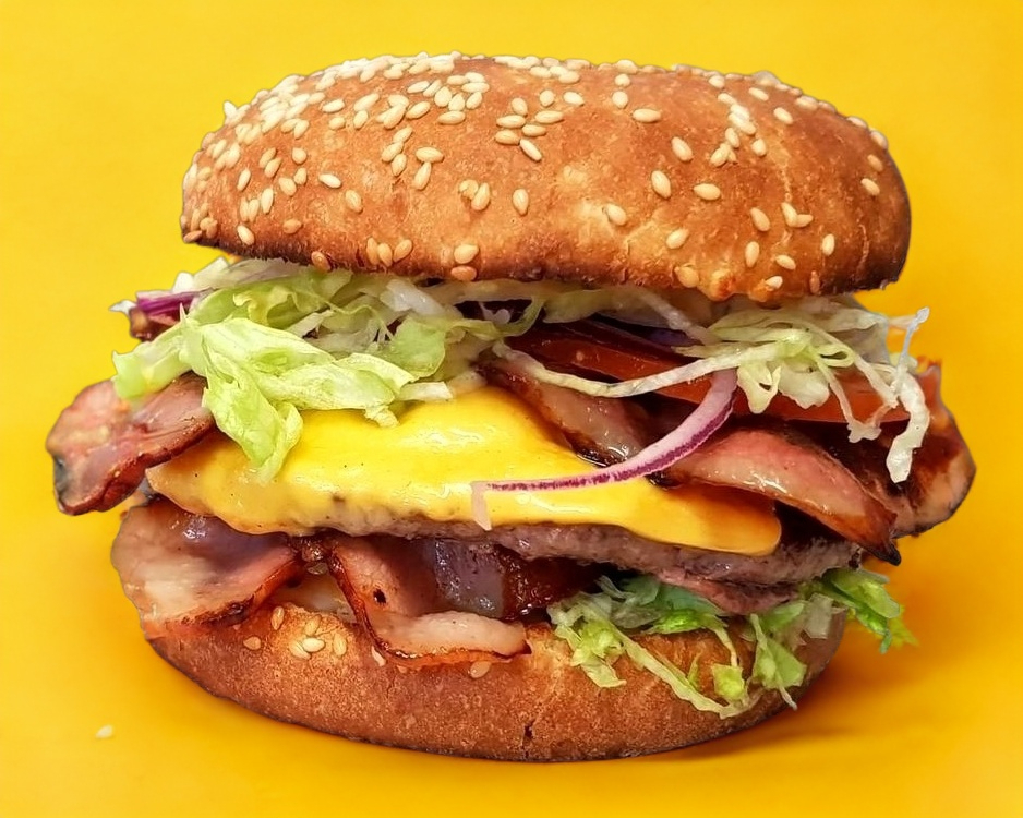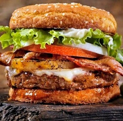 Hamburguesa con carne de res más boneless queso Oaxaca, jamón, queso amarillo, cebolla, jitomate, chiles y aderezos.