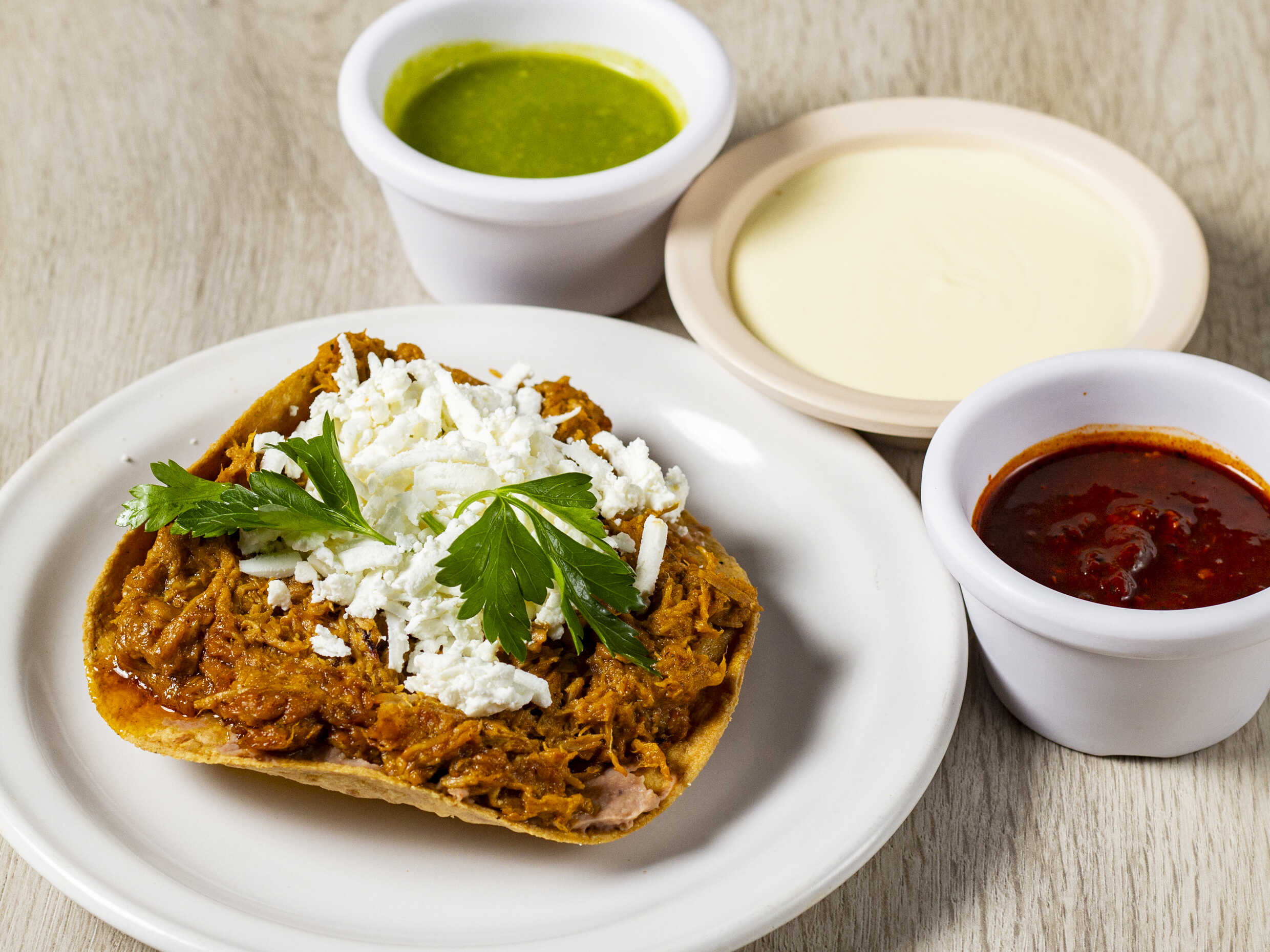 Crujiente tostada preparada con nuestra tradicional tinga de pollo, frijoles refritos, lechuga, crema y queso fresco.